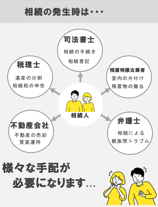 相続に伴う不動産売却は、 通常の売却とは異なり、 法律・税金そして感情など複雑な要素が絡み合います。弊社では税理士・司法書士・弁護士・不動産会社がチームとなりワンストップで対応致します 。
